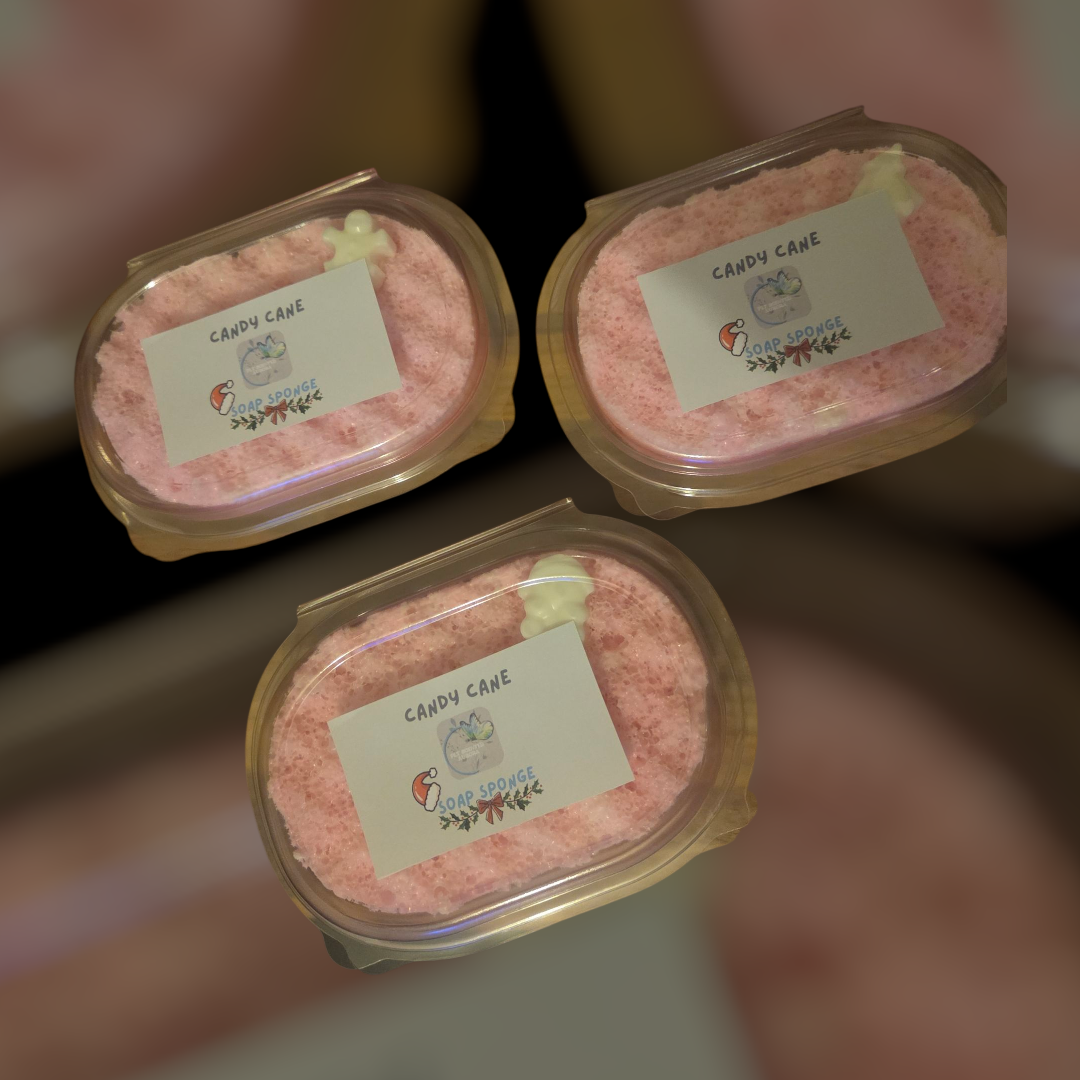To join our christmas collection, is our candy cane scented soap sponge. Perfect for christmas and the wintery season. Topped with a small candy cane scented soap.