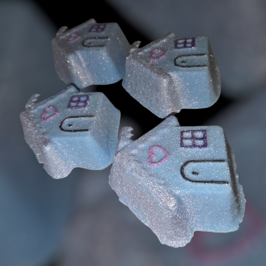 Christmas House Themed Bath Bomb, enjoy this christmas as a gift or for yourself. Blue toned bath bomb with hand painted features and a dusting of white on the roof top & House itself.
